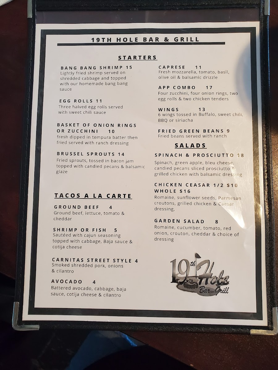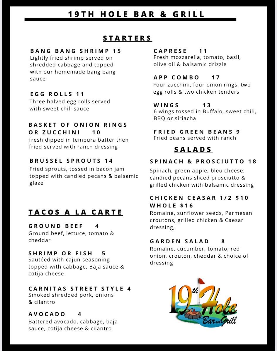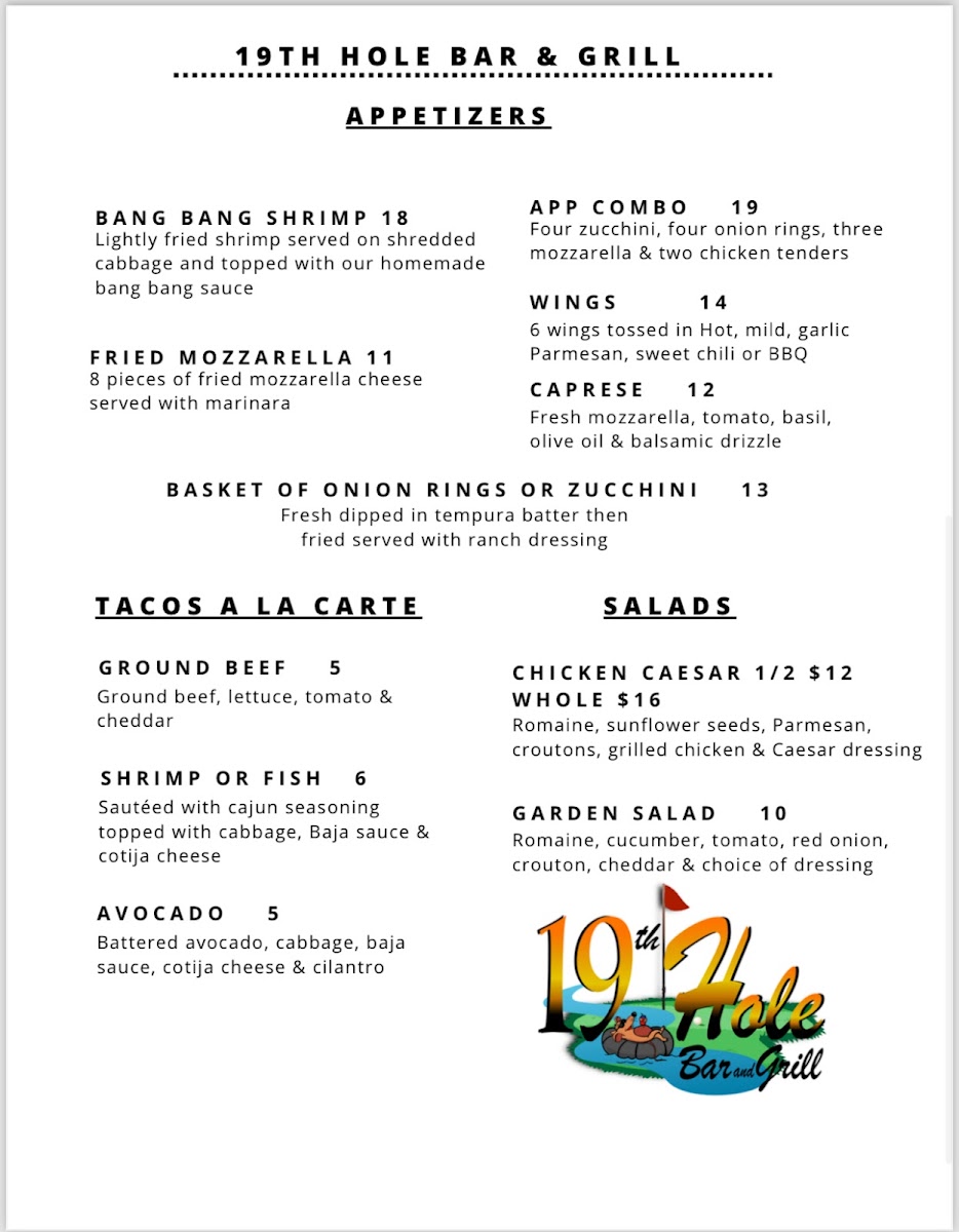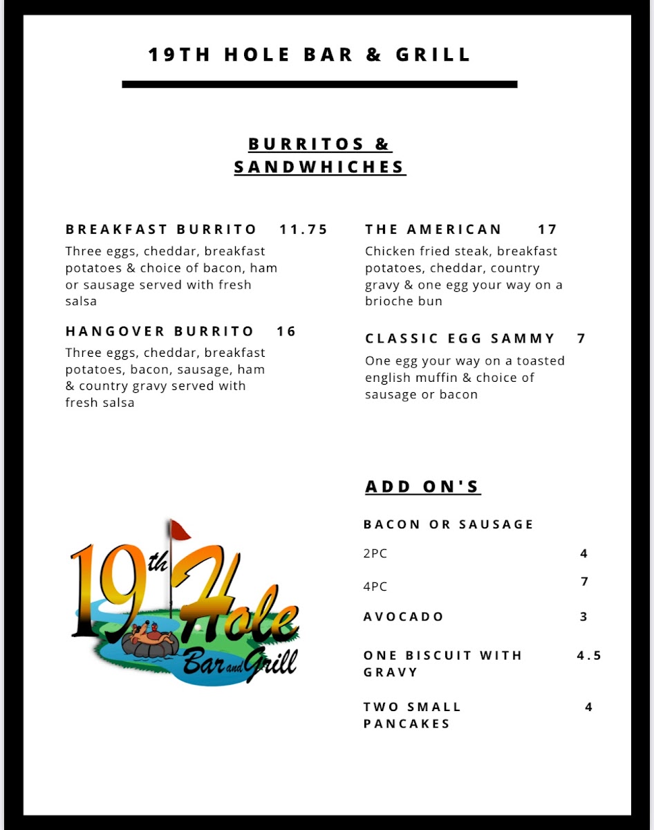 Welcome to the 19th Hole Bar & Grill, a hidden gem nestled at 144 Marina Dr in Needles, CA. This vibrant spot offers a delightful menu that caters to both breakfast enthusiasts and casual diners. Start your day with tempting options like the Hangover Burrito or indulge in Breakfast Tacos that are bursting with flavor. The Meat & Cheese Scramble is a favorite among patrons, perfectly matched with a refreshing beverage.